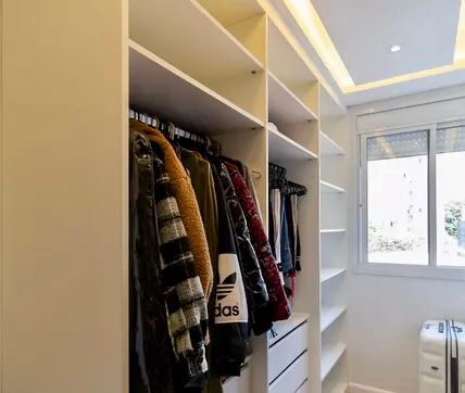 Armários embutidos no quarto, nos banheiros e na cozinha